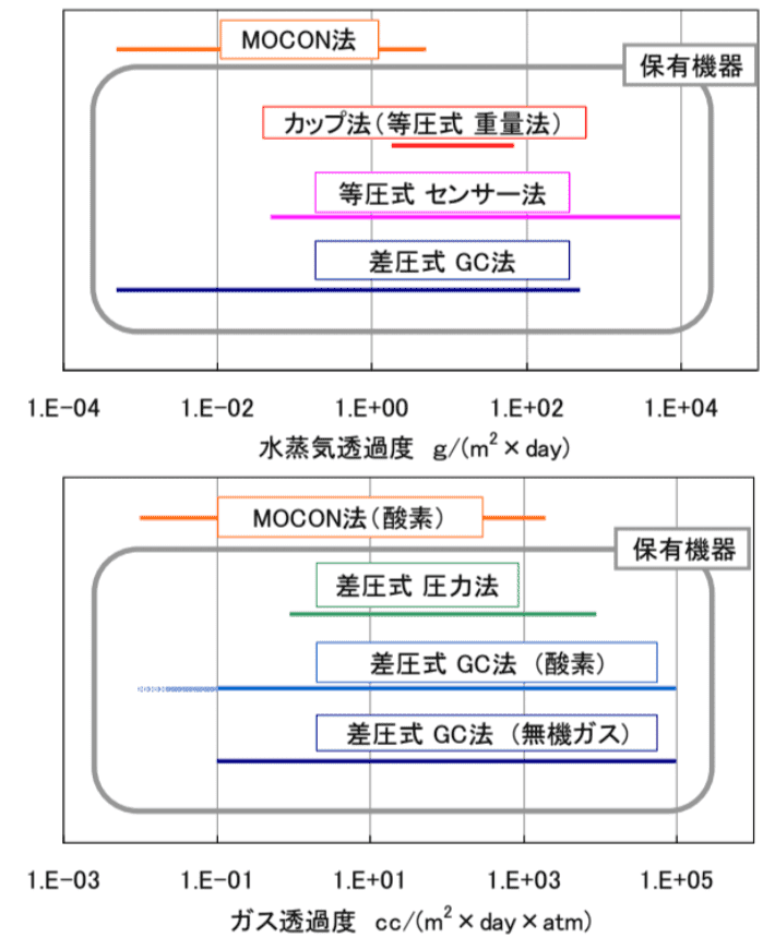 上下のセルの間に圧力差を印加する差圧法と、圧力差がない等圧法に大別され、更に透過量を検出する方法によって、異なる方式の装置が市販されています。