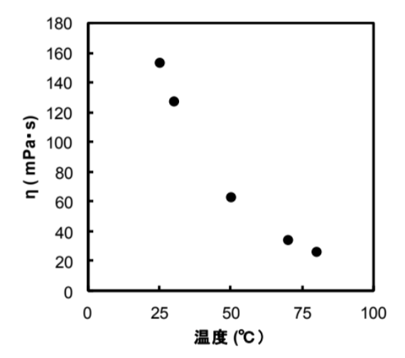 15%PVA水溶液(MW:14000)の溶液粘度の温度依存性(25~80℃)をEMS粘度計で測定した。【図3】、【表1】に測定結果を示す。