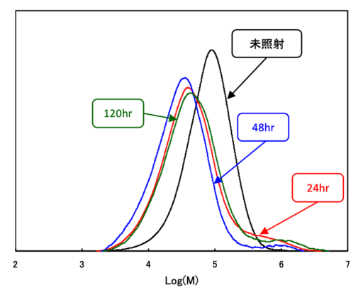 多くの高分子は長時間光の照射を受けると、劣化を生じ、やがて分子鎖切断して分子量が低下したり、架橋形成したりすることが知られています。今回は、アイスーパーUVテスターを用いて一定時間光を照射(耐候性試験)したPVCについて分子量測定を行いました。