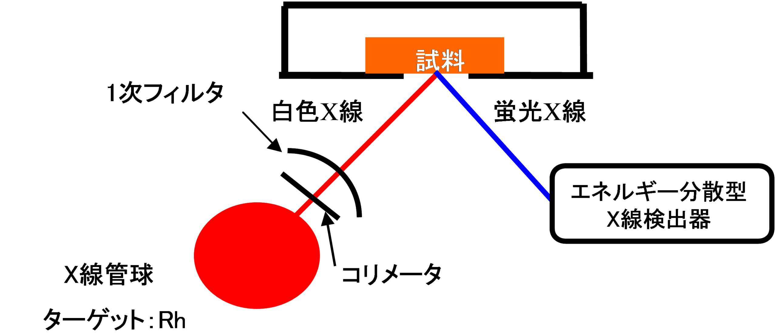 試料にX線を照射すると、試料から成分元素に応じたエネルギーの蛍光X線が発生する。この蛍光X線を検出器で測定し試料の定性・定量分析を行う。