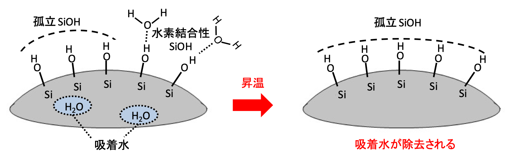 しかし、測定温度上昇につれ、吸着水や水素結合性SiOHピークが徐々に減少し、孤立SiOHピークの増加する様子が直接観測されました。