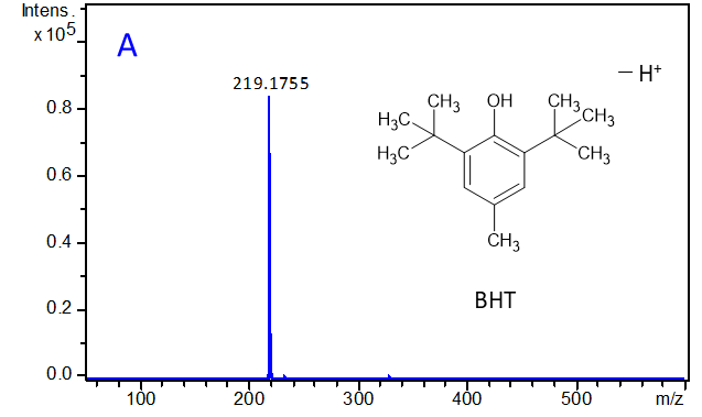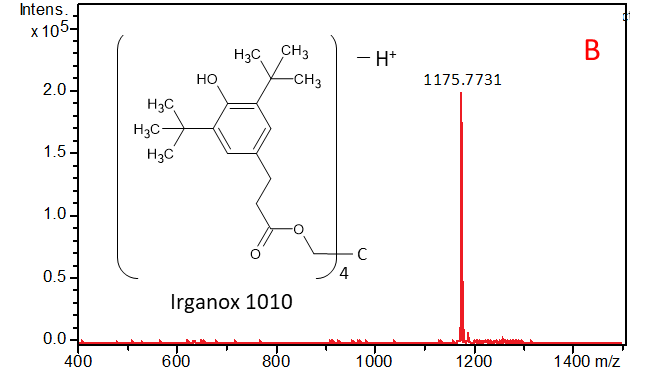 LC-MSにおける質量分析計(MS)もHPLC検出器の一種と言えます。MSでは測定成分をイオン化→質量ごとに分離することで溶出時間毎のマススペクトルが得られ、ピークを構成する成分の質量電荷比(m/z)を知ることができます(図4、5)。また、解析ソフトから任意の質量電荷比の検出強度でクロマトグラムを描写することも可能であり(抽出イオンクロマトグラム)、溶出位置の確認や定量に使用します(図6)。