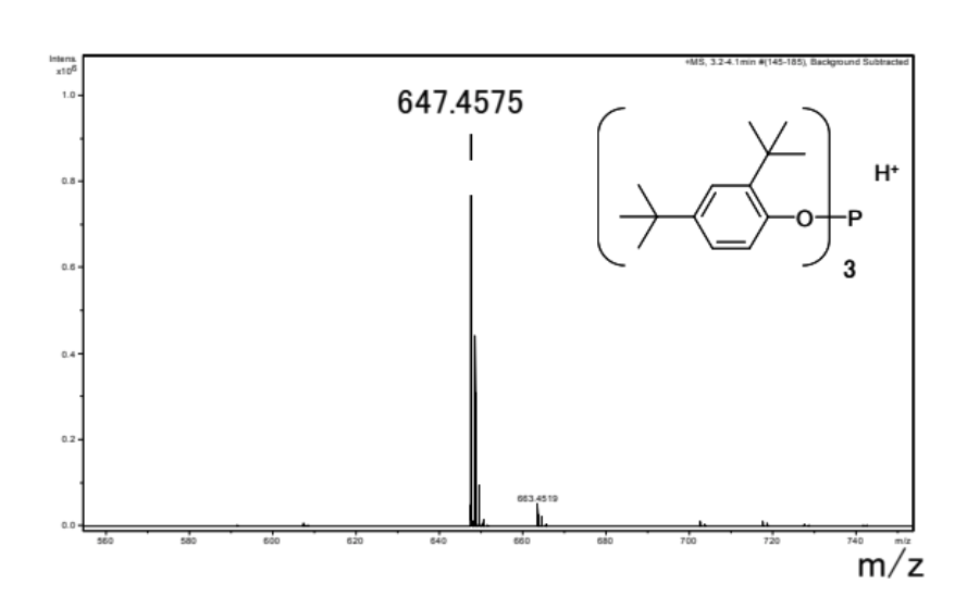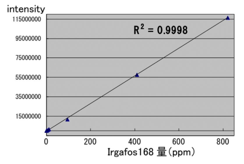 リン系酸化防止剤はポリマーの酸化劣化防止を目的として加えられる添加剤です。分子量が大きいためにGCでは測定が困難な種類を含めて、LC-TOF/MSを用いて分析することが可能です。精密質量及び同位体パターンから同定し、標準試料による検量線から定量を行います。