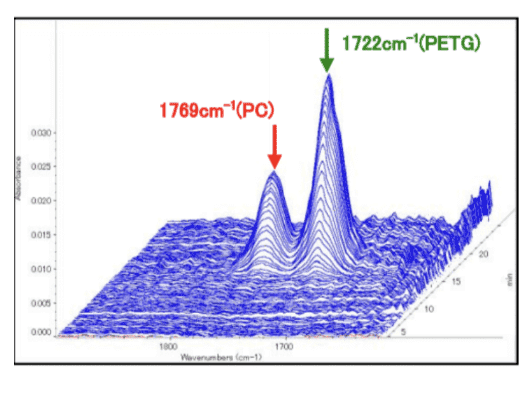 GPC(SEC)にFTIR検出器を用いることにより、特定の官能基に由来する赤外吸収ピークから、その官能基の濃度分布を求めることが可能となります。これを用いれば、異なるポリマーをブレンドした試料について、各々に関する情報を同時に得ることができます。