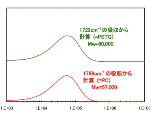 PETG/ PCブレンド試料のGPC-FTIRによる 3D-クロマトグラムを図1に示します。図1は、各ポリマーのC=O伸縮振動に起因する吸収ピークの溶出曲線を示していますが、PETG(=1722cm-1)、PC(=1769cm-1)と波数が異なるため、それぞれ溶出曲線を分けることが可能となります。これらの吸収ピークの溶出曲線から得られた分子量分布曲線を図2に示します。両者の分子量が良好に測定できていることがわかります。