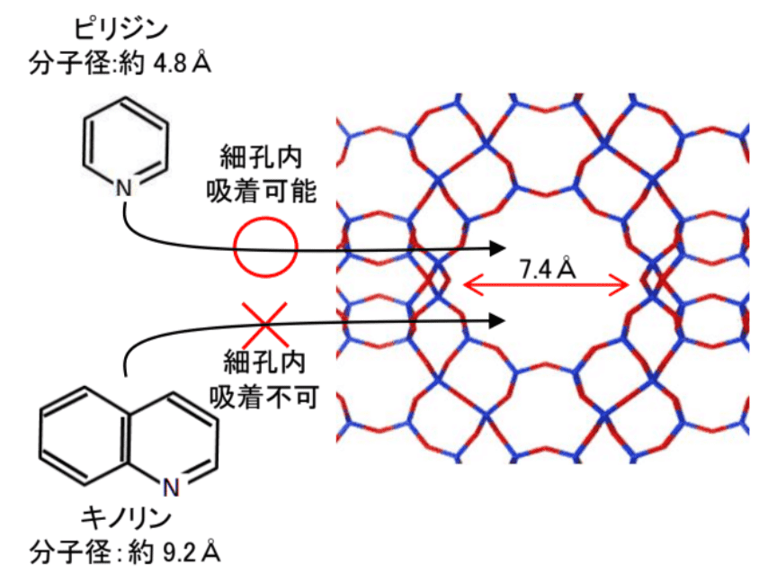 ゼオライトにピリジン及びキノリンをプローブ分子として吸着させ、FT-IR測定を行いY型ゼオライトの酸点を解析しました。ゼオライト細孔とプローブ分子の大きさの関係から、ピリジンはバルク(結晶表面、細孔内部)、キノリンは結晶表面の酸点を評価可能です。
