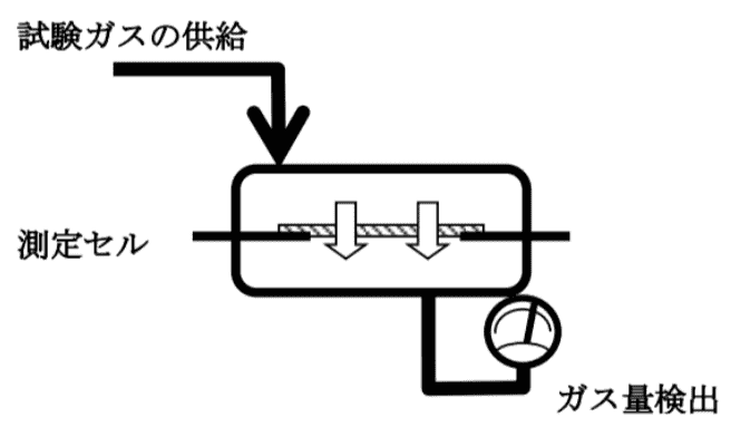 図1にガス透過試験装置の基本的な構造を示しました。試験体(通常はフィルム)を上下のセルと呼ばれる蓋で挟み、一方のセルから試験体を介して他方のセルへ透過してきたガス量を計測します。