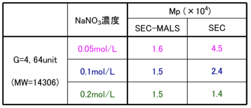 塩濃度の増加に伴って溶出時間が遅れる1)ため、GPC法による換算分子量では、塩濃度の増加に伴って得られるMpが低下する傾向が見られますが、これに対しGPC-MALS法によって得られたMpは塩濃度の影響を受けず、また、理論値とも近い結果となっています。