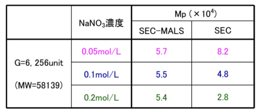 - 1) 塩濃度の増加に伴って、溶離液中でのデンドリマーの分子サイズが低下するためと考えられます。