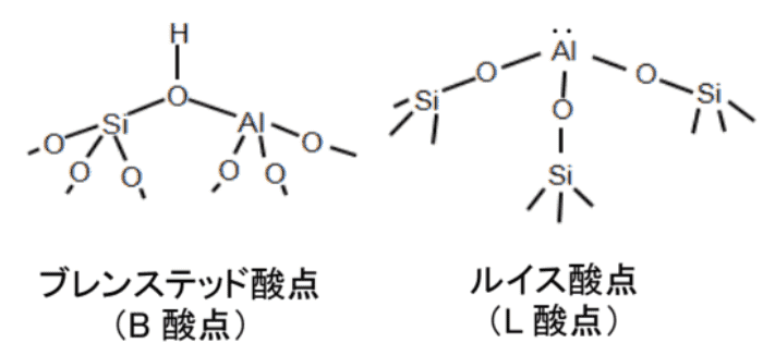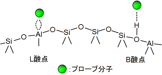 ゼオライトには性質の異なる二種類の酸点 (ブレンステッド(B)酸点、ルイス(L)酸点)が存在し、固体酸触媒として作用します。プローブ分子吸着FT-IR法ではこれらの酸点を区別して評価可能です。