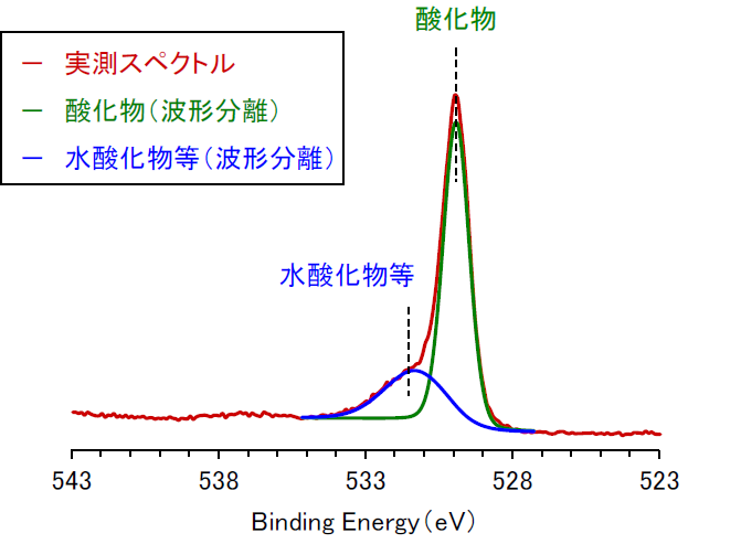 理論値との組成差異が確認された酸素に着目し、化学状態解析を行いました。酸素の高分解能スペクトルを、ピーク波形分離結果とあわせて図3に示します。2種類の化学状態を確認でき、ピーク位置より、酸化物(Fe2O3)及び水酸化物等(2)への帰属が推定されます。
