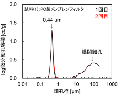 本測定では、一度測定した試料を続けて再測定しており、結果をそれぞれ1回目、2回目と示しています(2 回目は10 µm 以下の領域のみ測定)。両者はほぼ一致しており、加圧に伴う一時的な弾性変形の可能性はあるものの、試料構造は概ね維持されたと考えられました。ピーク位置は細孔分布の最頻値を示しており、本試料では細孔径 0.44 µm が最も多いことがわかります。この値は、【図3】の SEM 像で確認される細孔径(約 0.4 µm)、およびカタログ値(0.4 µm)ともほぼ一致しました。